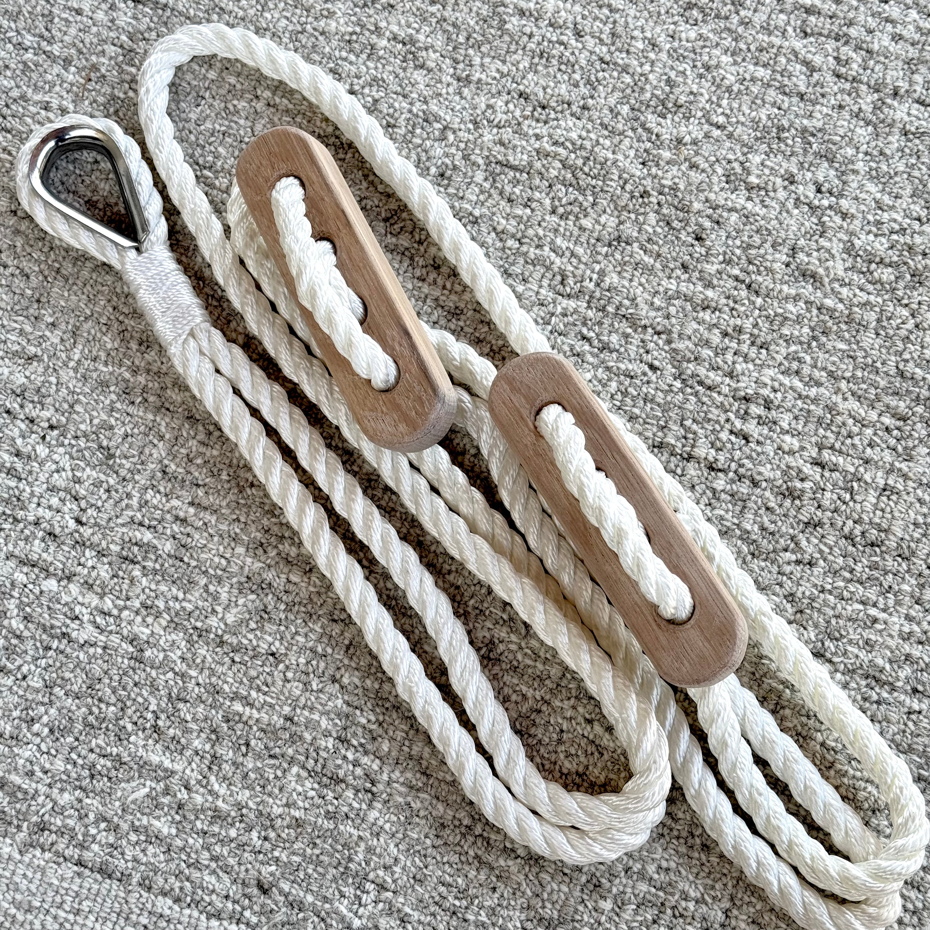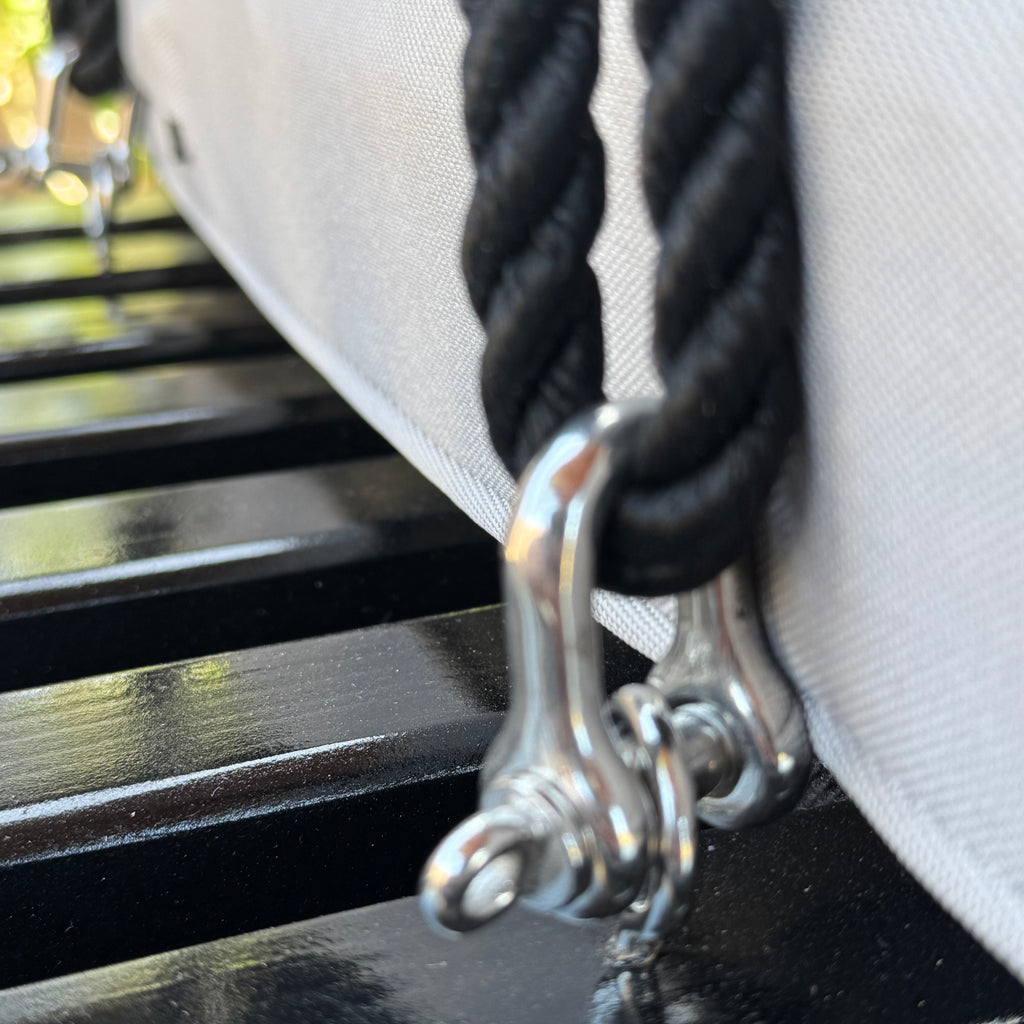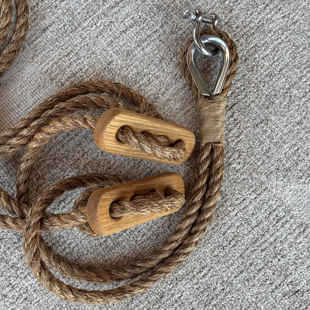 Rope Materials are: Natural Manila ( Grass fibers), Neo Manila ( Polypropylene) and polyester in choice of color. All metal pieces are stainless steel. Rope strengths are high, with breaking limits exceeding 1 ton. The safe recommended weight limits are: 1/2" Rope : 600 lbs 3/4" Rope : 900 lbs 1 In Rope : 1200 Lbs Wood Discs are made from exterior hardwoods. In choice of finish.