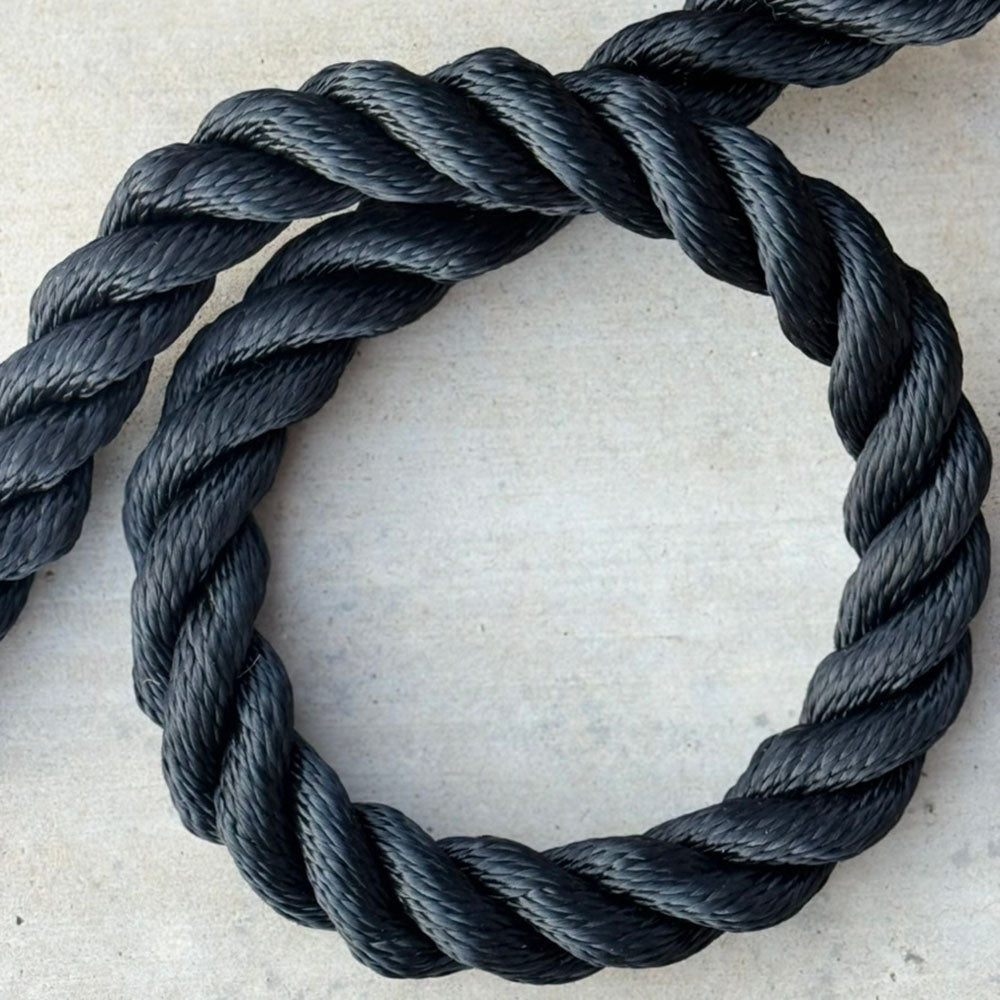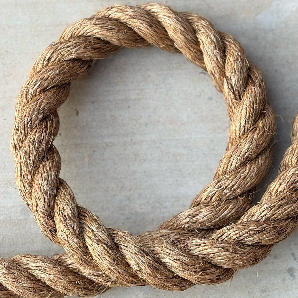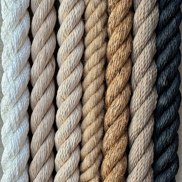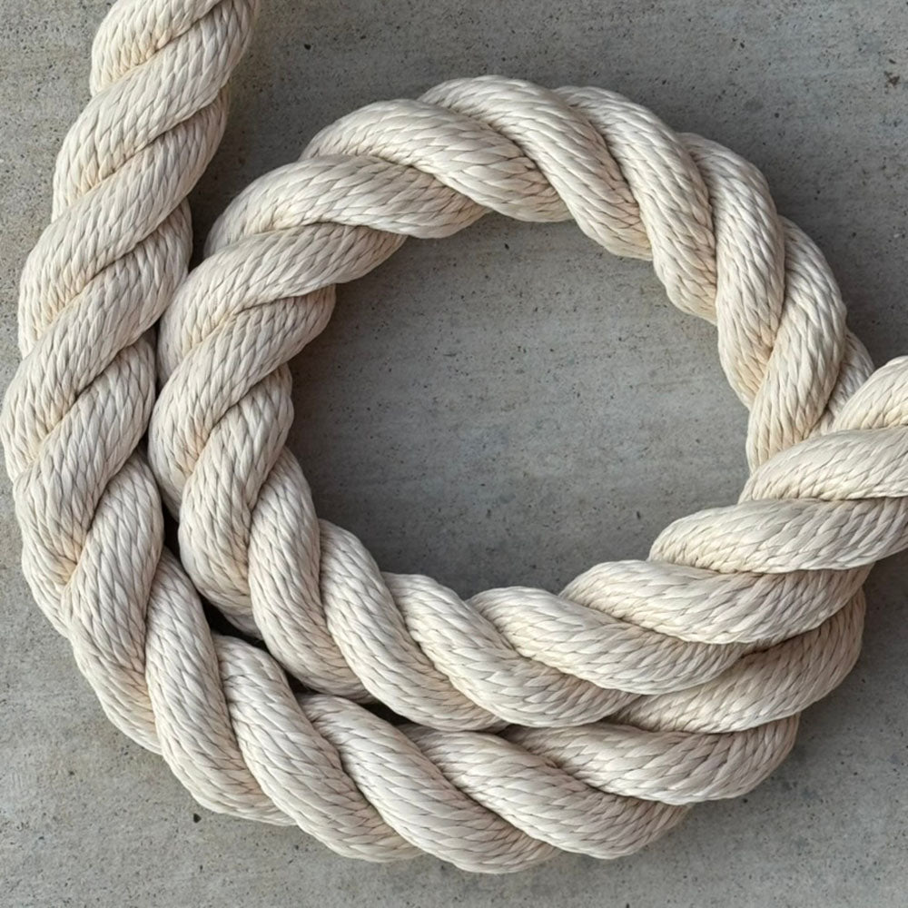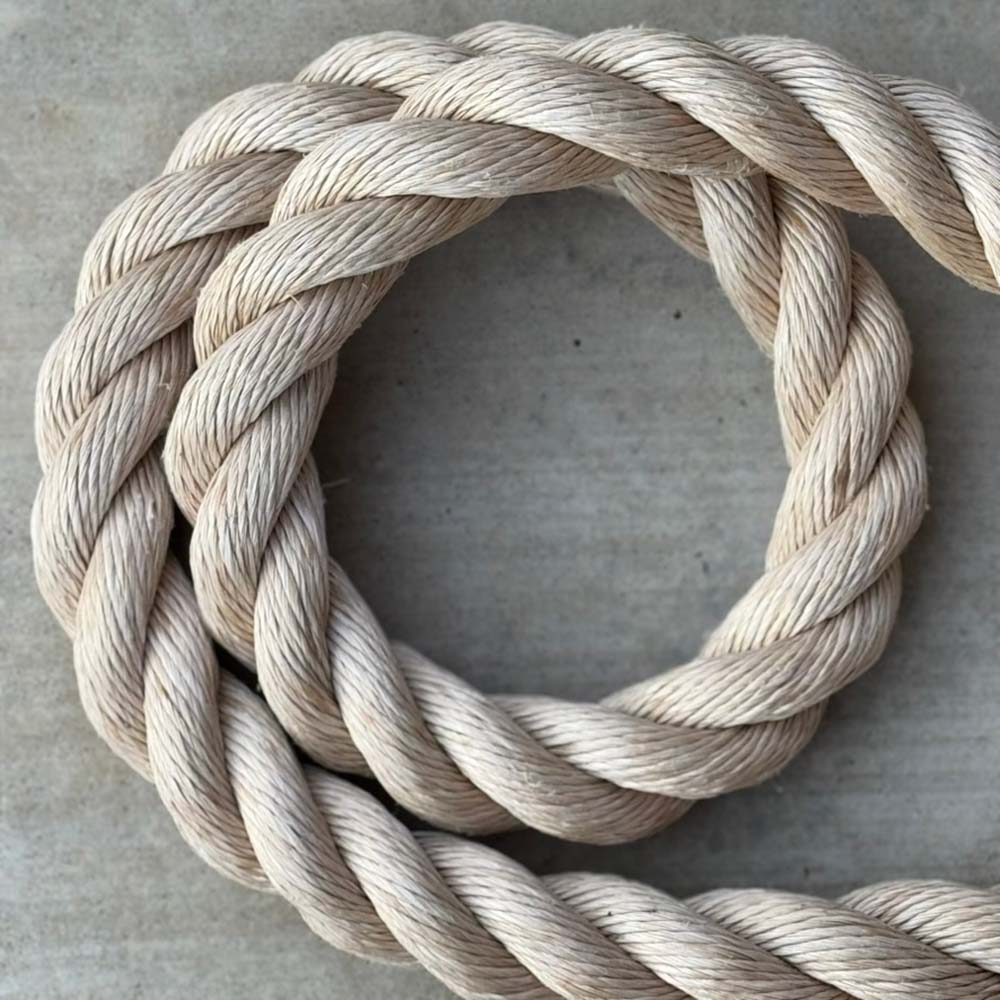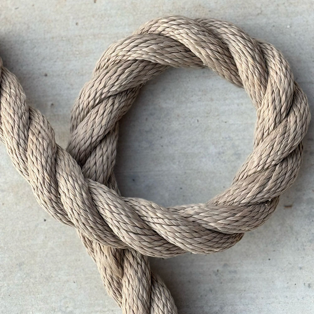 Polyester: Strong rope with a breaking strength exceeding 15 tons. Holds its color indoors and outdoors. Stretch resistant. Polypropylene: Longer life than natural fibers. Stretch resistant and offers a strong breaking stretch exceeding 10 tons. Hemp: A beautiful, soft and decorative rope. Made from natural fibers. 2 ton breaking limit. Manila: Natural fiber rope, a bit rougher than hemp, offers a great rustic appearance. 8 ton breaking limit. Rope materials by color: White: Polyester Neo Manila : Polypropylene Tan: Polyester Hemp: Hemp Natural Manila: Manila Camel: Polyester Black: Polyester