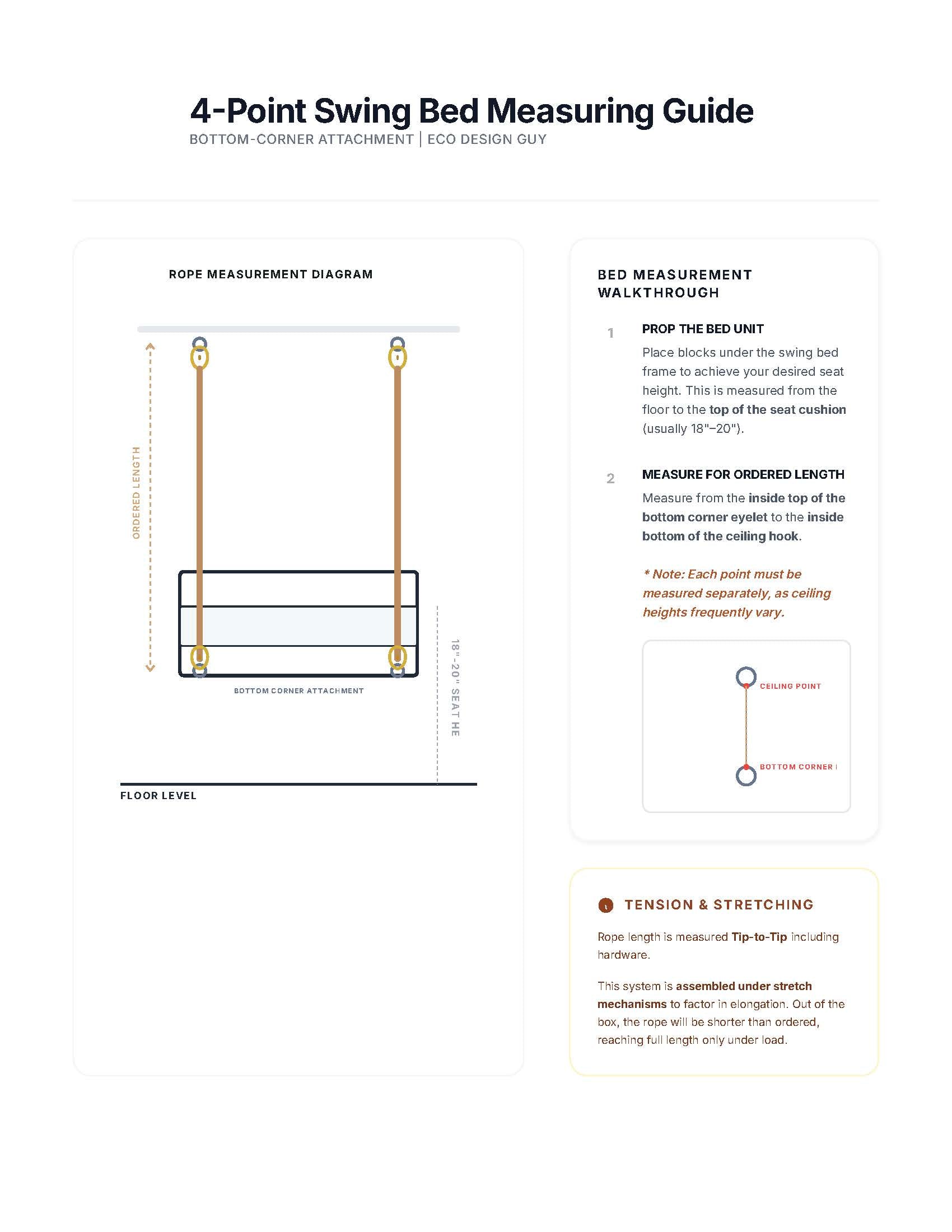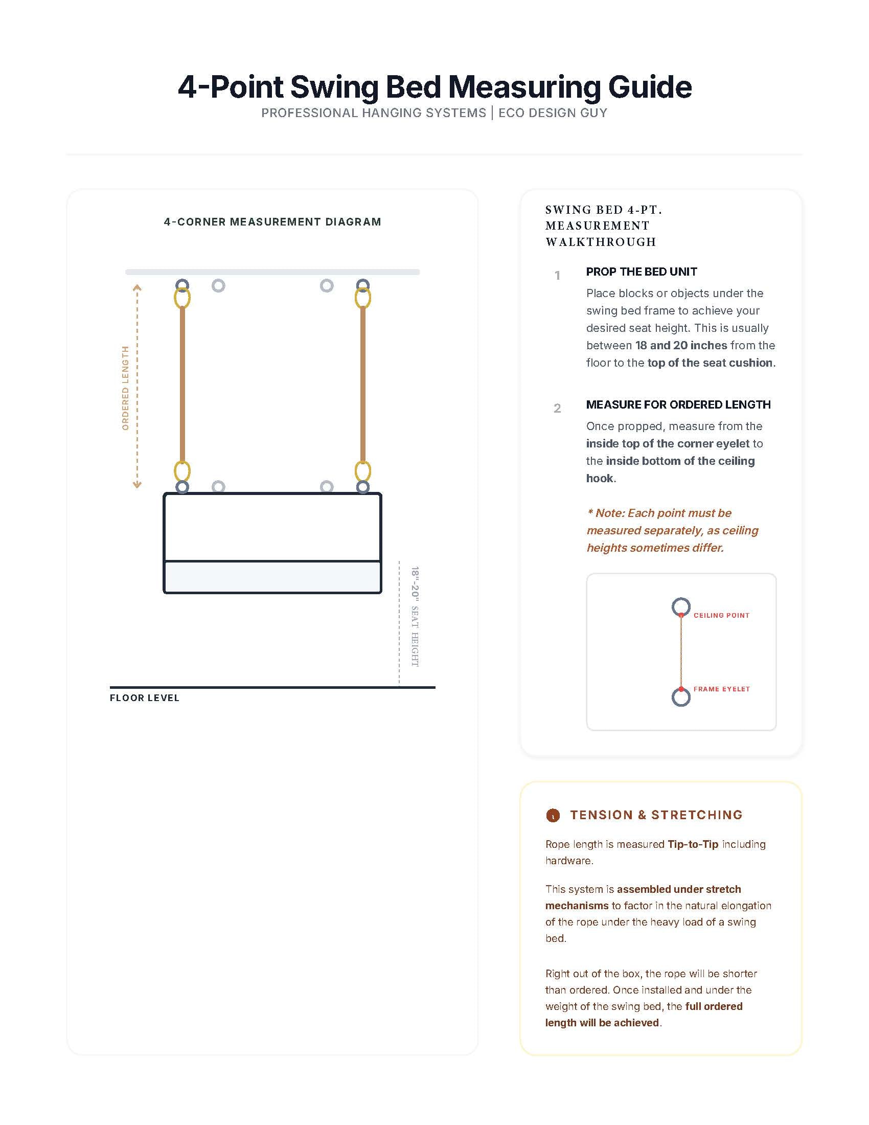 This rope system is designed to offer a clean line, no bulky knots, minimalist design aesthetic. Perfect for contemporary and modern porch swings and swing beds.